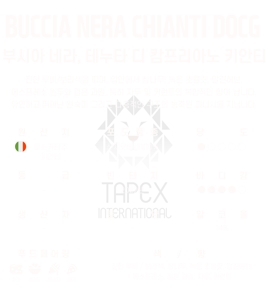 진한 루비/보라색을 띠며, 입안에서 삼나무, 녹은 초콜릿, 말린허브